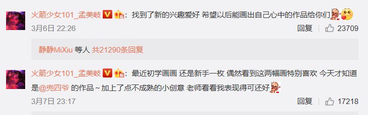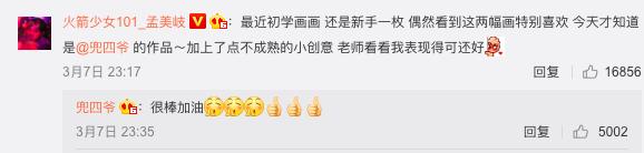 但接下來就是翻盤時刻——隨后,孟美岐就在評論區(qū)回復(fù)兜四爺,她寫道“最近初學(xué)畫畫,還是新手一枚,偶然看到這兩幅畫特別喜歡,今天才知道是兜四爺?shù)淖髌?,加上了點不成熟的小創(chuàng)意,老師看看我表現(xiàn)得可還好”。