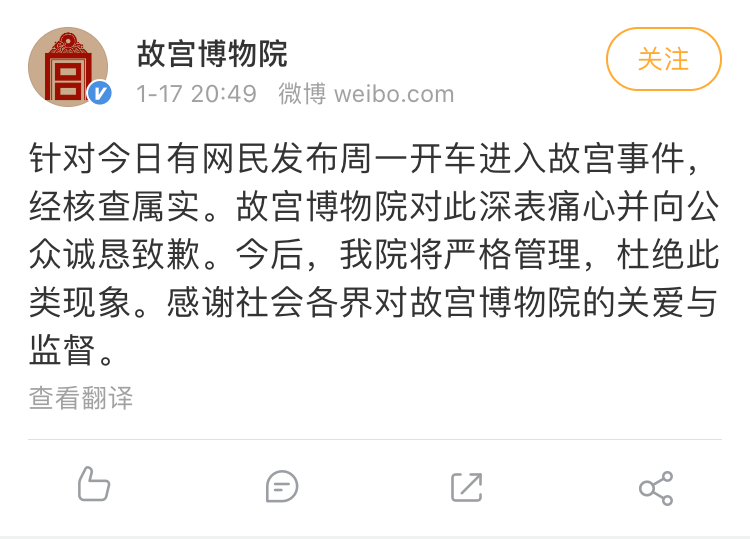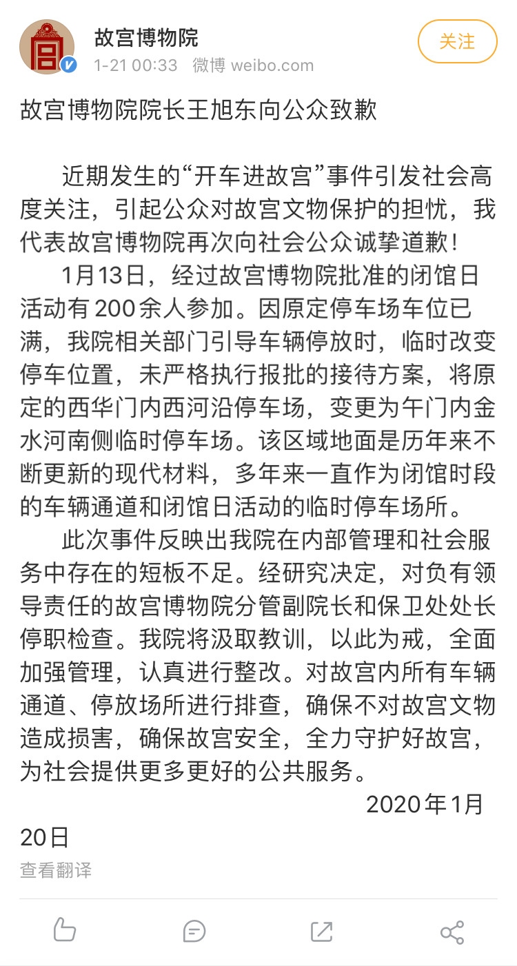 今天凌晨,故宮博物院院長(zhǎng)王旭東再次通過(guò)故宮博物館官微發(fā)表了致歉,這是故宮就#開(kāi)奔馳進(jìn)故宮#事件發(fā)生以來(lái)第二次致歉。