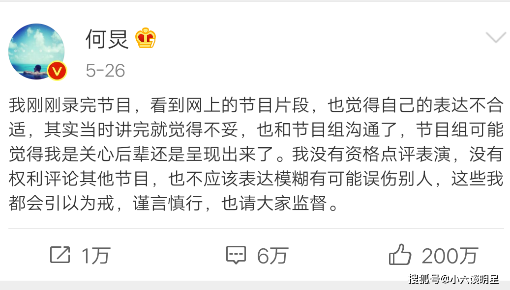 何老師在道歉中提到,自己在講完這些話就已經(jīng)覺得有些不妥,所以就去找節(jié)目組溝通了,但節(jié)目組認(rèn)為自己是關(guān)心后輩,不會有什么大問題,所以就把視頻呈現(xiàn)了??纯?,在這兩句話里,何老師直接就把責(zé)任推到了節(jié)目組身上,也就是說,雖然話是我說的,但是事是你們辦的,所以直接就把禍水引到了節(jié)目組身上,也就是說,雖然話是我說的,但是事是你們辦的,所以直接就把禍水引到了節(jié)目組的身份,畢竟不能因?yàn)檫@一點(diǎn)小事就起訴整個節(jié)目組吧,所以這件事情最后也只能不了了之,大事化小,小事化了。