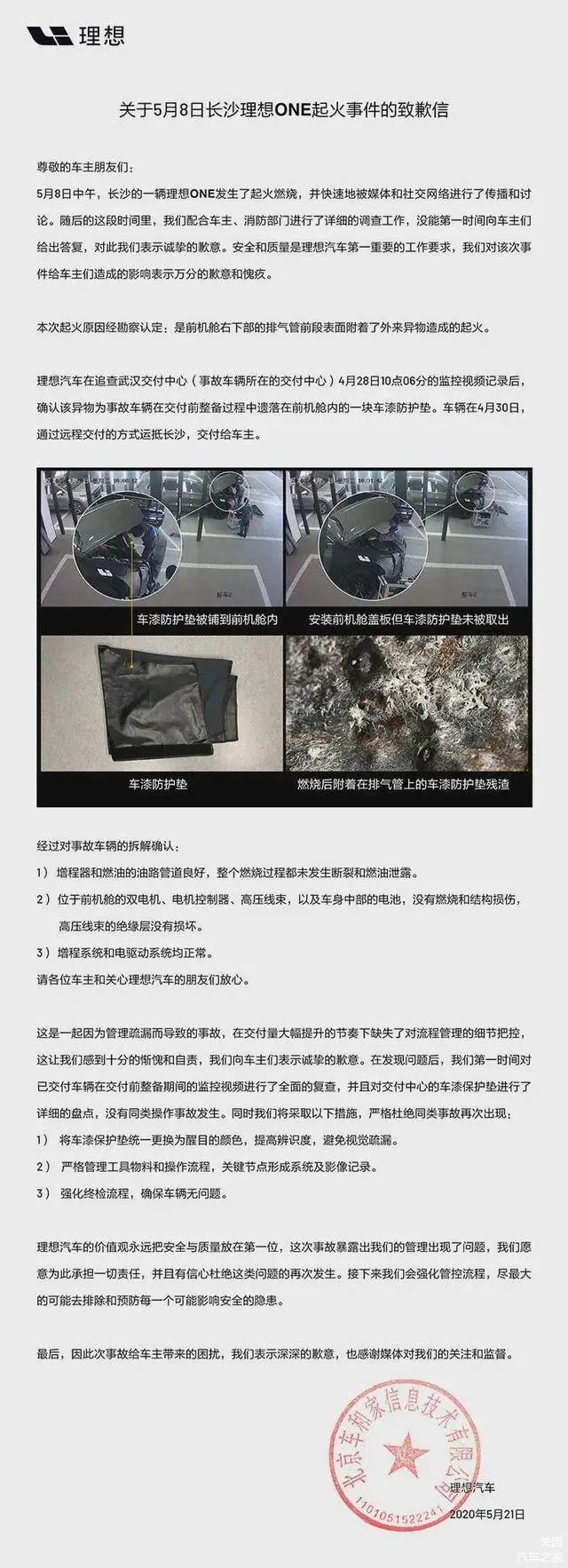 半個(gè)月后的5月21日,理想汽車在官微上公布了5月8日長沙理想ONE自燃的原因并道歉。根據(jù)理想汽車的表述,本次起火原因經(jīng)勘查認(rèn)定:是前機(jī)艙右下部的排氣管前段表面附著了外來異物造成的起火。此異物為事故車輛在交付前整備過程中遺落在前機(jī)艙內(nèi)的一塊車漆防護(hù)墊。