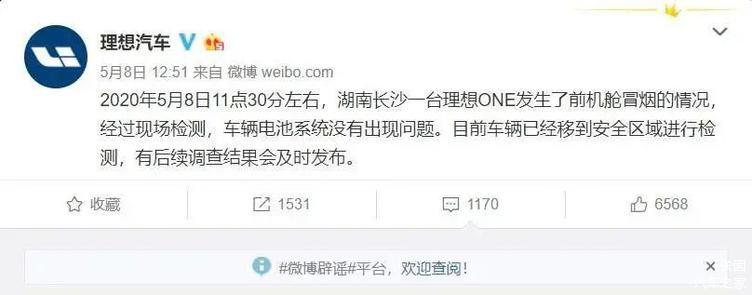 隨后新浪微博@理想汽車第一時(shí)間做出了事故回應(yīng):2020年5月8日11點(diǎn)30分左右,湖南長沙一臺理想ONE發(fā)生了前機(jī)艙冒煙的情況,經(jīng)過現(xiàn)場檢測,車輛電池系統(tǒng)沒有出現(xiàn)問題。目前車輛已經(jīng)移到安全區(qū)域進(jìn)行檢測,有后續(xù)調(diào)查結(jié)果會及時(shí)發(fā)布。