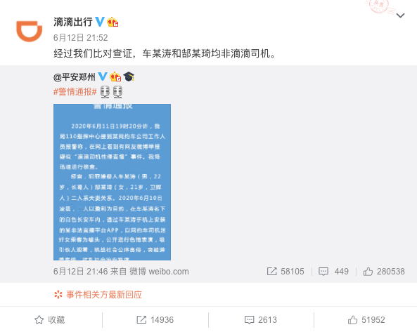 6月12日 21:52,鄭州公安雷霆辦案,真相大白。@平安鄭州公布事實(shí):視頻表演者是夫妻關(guān)系,兩人所作所為只是為了在非法直播App通過色情表演牟利。在@平安鄭州發(fā)布通報(bào)6分鐘后,滴滴官微轉(zhuǎn)發(fā),時(shí)間緊急,只說了最關(guān)鍵的信息:“經(jīng)過我們比對查證,車某濤和郜某琦均非滴滴司機(jī)。”滴滴與滴滴司機(jī)再一次被誤傷,實(shí)錘。