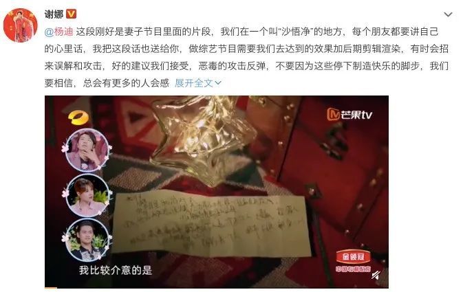 楊迪另一好友謝娜,在中午也發(fā)聲力挺楊迪,稱(chēng)做綜藝要達(dá)到的效果和剪輯渲染,有時(shí)會(huì)招來(lái)誤解和攻擊,好的建議我們接受,惡毒的攻擊反彈。言下之意很就是:楊迪被誤解和攻擊了。
