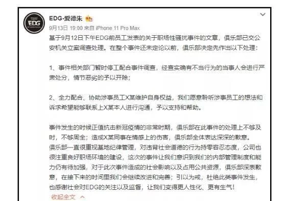 而EDG官博的發(fā)聲再次將群眾的怒火點燃,因為受害者女主在EDG發(fā)布公告之前就已經放出了實錘的視頻證據(jù),,而EDG官方這樣的回應,不得不讓吃瓜群眾們認為EDG的管理層是不是已經傻掉了?不僅毫無意義還使得公關危機更加嚴重,隨后驚動了EDG老板愛德朱出來發(fā)聲,并表示已經交給公安機關處理,對受害者表示歉意并愿意提供合理的支持和幫助。
