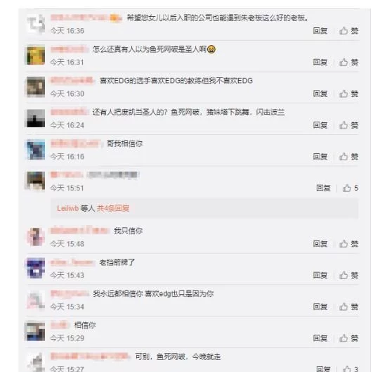 而廠長的微博底下也被一些吃瓜群眾評論早在WE“魚死網破,今晚就走”的廠長不少什么好人。有廠長的粉絲則說自己喜歡的不是EDG而是廠長,希望EDG不要拿廠長出來擋槍。小編認為EDG這波操作真有點拿廠長出來擋箭的味道了,給小伙伴對此怎么看呢?