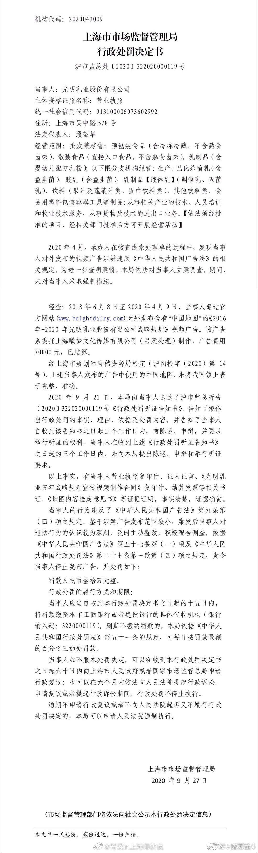 但由于國(guó)家企業(yè)信用信息公示系統(tǒng)相關(guān)網(wǎng)絡(luò)頁(yè)面中,對(duì)此次光明乳業(yè)處罰的行政處罰決定書(shū)尚無(wú)法查看,目前尚不得知光明乳業(yè)投放廣告存在的具體問(wèn)題為何。