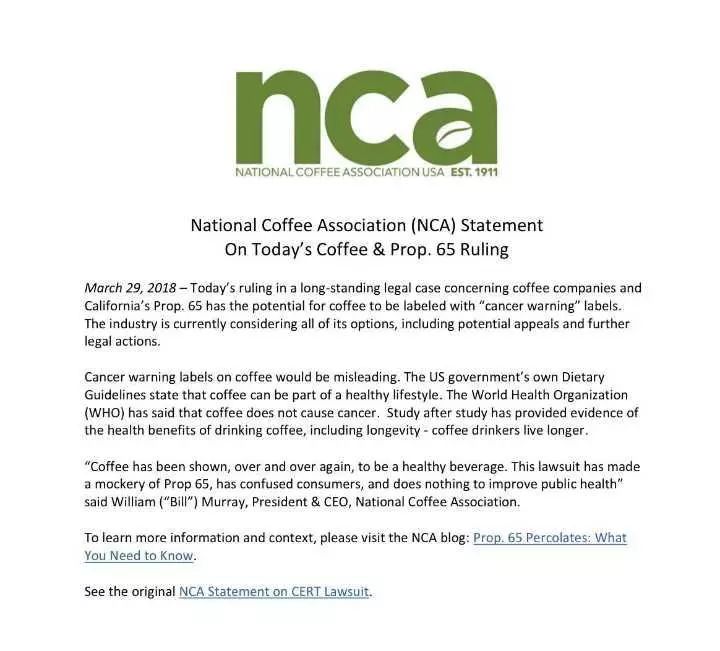 全美咖啡行業(yè)協(xié)會關(guān)于加州第65號判決的公告 (2018年3月29日)