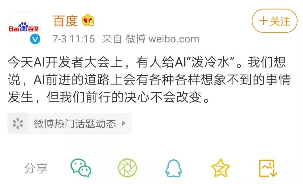 百度微博當(dāng)事發(fā)時立刻在微博上做出回應(yīng),“今天AI開發(fā)者大會上,有人給AI“潑冷水”。我們想說,AI前進的道路上會有各種各樣想象不到的事情發(fā)生,但我們前行的決心不會改變。 ?”