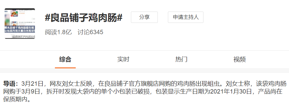 3月21日,廣東的劉女士發(fā)微博稱,自己3月9日下單,在良品鋪子旗艦店中購買的雞肉腸爬滿了蛆蟲!劉女士表示,零食小包裝有破損,但大包裝完好無損,生產(chǎn)日期為1月30日,保質(zhì)期為180天。