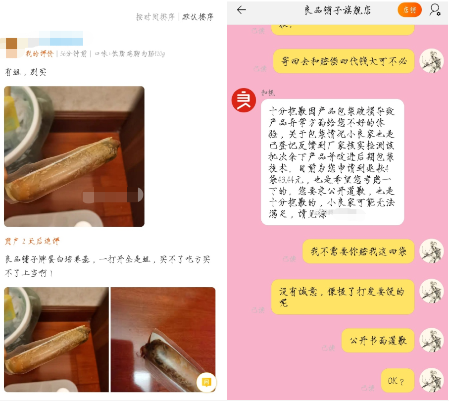 3月21日,廣東的劉女士發(fā)微博稱,在良品鋪子旗艦店購買雞肉腸竟然爬滿了蛆蟲!劉女士與良品鋪子的客服溝通,要求公開道歉,卻遭到了拒絕。