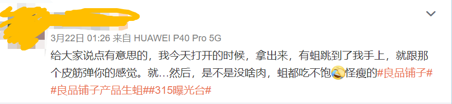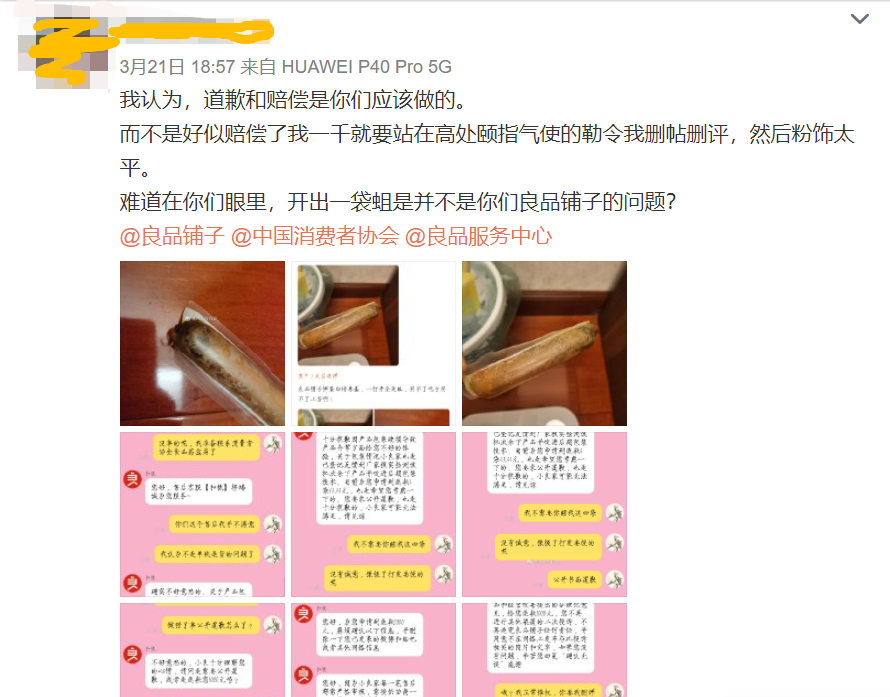 3月21日,湖北良品鋪子云服務(wù)科技有限公司通過官方微博@良品服務(wù)中心 ,在該網(wǎng)友微博下評論稱: