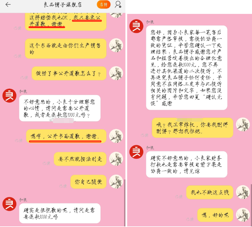劉女士還還貼出了自己與旗艦店客服的對話,在對話中,劉女士一再表示自己不要求賠償,但要求良品鋪子公開書面道歉。而良品鋪子方面則表示,可以退還43.44元的退款,不會公開道歉。