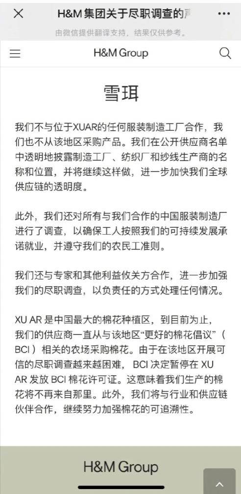 這份聲明寫(xiě)道:H&M集團(tuán)對(duì)來(lái)自民間社會(huì)組織的報(bào)告和媒體的報(bào)道深表關(guān)注,其中包括對(duì)新疆維吾爾自治區(qū)少數(shù)民族強(qiáng)迫勞動(dòng)和宗教歧視的指控。(H&M Group is deeply concerned by reports from civil society organisations and media that include accusations of forced labour and discrimination of ethnoreligious minorities in Xinjiang Uyghur Autonomous Region (XUAR).)