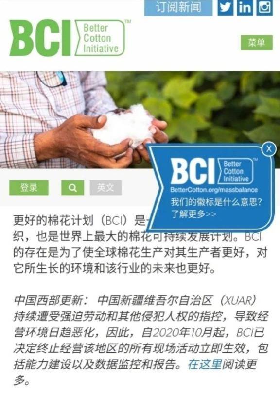 聲明稱(chēng),新疆是中國(guó)最大的棉花種植區(qū),到目前為止,我們的供應(yīng)商從該地區(qū)與“更好的棉花計(jì)劃”(BCI)相關(guān)的農(nóng)場(chǎng)采購(gòu)棉花。由于在該地區(qū)進(jìn)行可信的盡職調(diào)查變得越來(lái)越困難,BCI已決定暫停在新疆發(fā)放BCI棉花許可證。這意味著我們產(chǎn)品所需要的棉花將不再?gòu)哪抢铽@得。(XUAR is China’s largest cotton growing area, and up until now, our suppliers have sourced cotton from farms connected to Better Cotton Initiative (BCI) in the region. As it has become increasingly difficult to conduct credible due diligence in the region, BCI has decided to suspend licensing of BCI cotton in XUAR. This means that cotton for our production will no longer be sourced from there. )