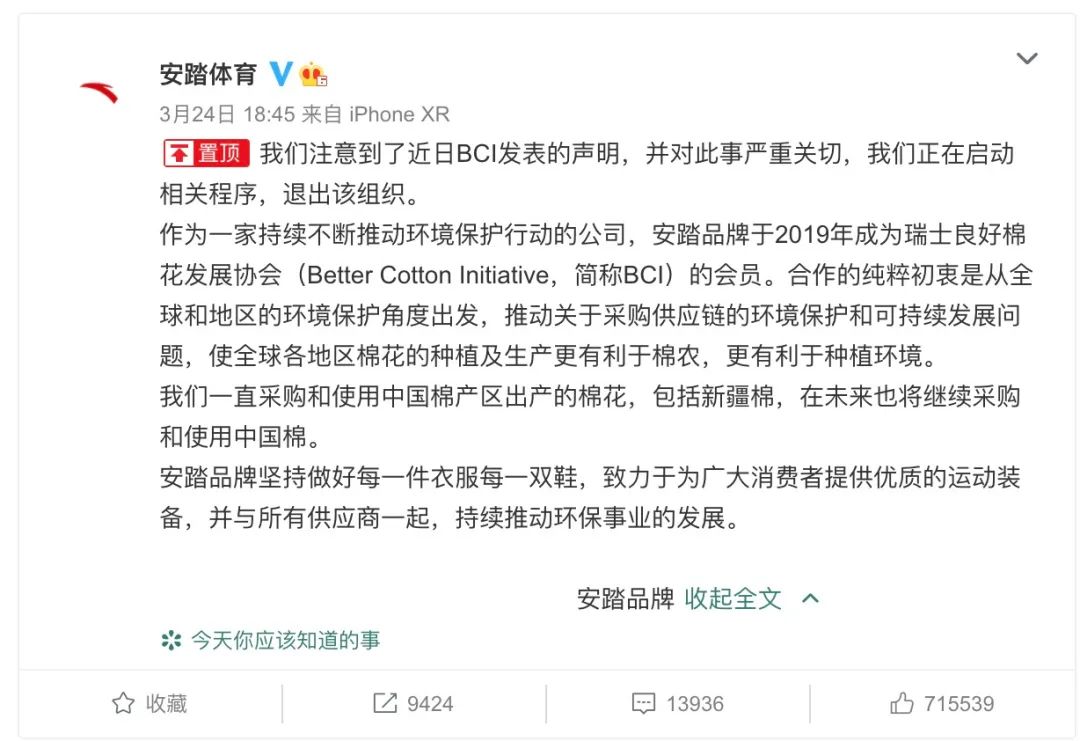 而與此同時(shí),國(guó)產(chǎn)品牌品牌安踏則迅速發(fā)布聲明,并宣布退出位于瑞士的良好棉花發(fā)展協(xié)會(huì)BCI組織,不得不說(shuō)這手來(lái)得漂亮,時(shí)間也拿捏到位,態(tài)度鮮明,很多網(wǎng)友跑到其微博下表態(tài),說(shuō)以后只買(mǎi)國(guó)貨,只穿安踏等等。