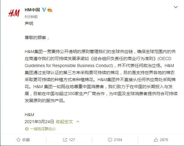 相關(guān)話題和事件引起社會(huì)各界廣泛關(guān)注。H&M集團(tuán)這份聲明到底寫(xiě)了什么內(nèi)容?