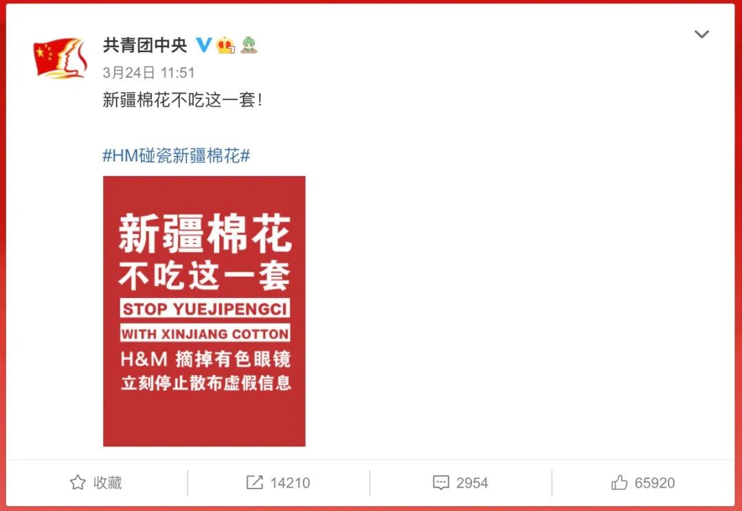 今天,@共青團(tuán)中央 微博發(fā)布的兩條有關(guān)H&M公司#碰瓷新疆棉花#的消息引發(fā)網(wǎng)友廣泛關(guān)注。