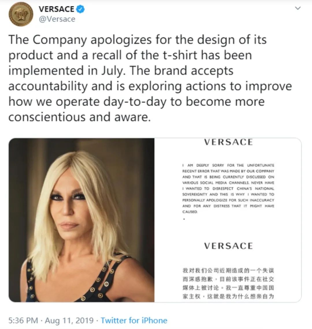輿論發(fā)酵,網(wǎng)上一片抵制聲,而Versace范思哲緊急致歉,之后還應(yīng)網(wǎng)友強(qiáng)烈要求,在外網(wǎng)以及幾大社交媒體同步以中英文形式公開(kāi)道歉。