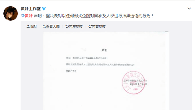 黃軒工作室聲明稱(chēng),“我司藝人黃軒與H&M品牌已無(wú)合作。黃軒及團(tuán)隊(duì)堅(jiān)決反對(duì)任何形式企圖對(duì)國(guó)家及人權(quán)進(jìn)行抹黑造謠的行為!特此聲明!”
