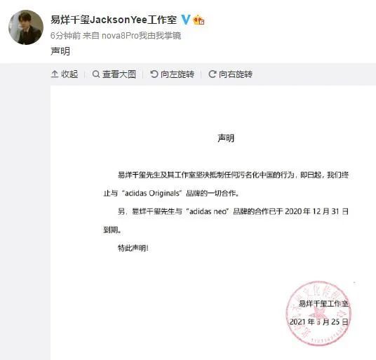 傍晚,易烊千璽工作室發(fā)聲明宣布@TFBOYS-易烊千璽 及工作室堅決抵制任何污名化中國的行為,即日起,終止與阿迪達斯品牌的一切合作。