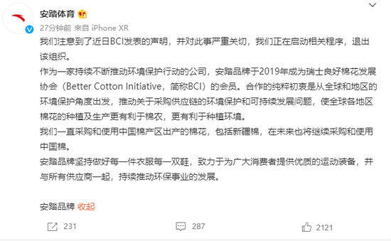 有因收購洋品牌而被波及但立馬宣布退出BCI的品牌,比如安踏。