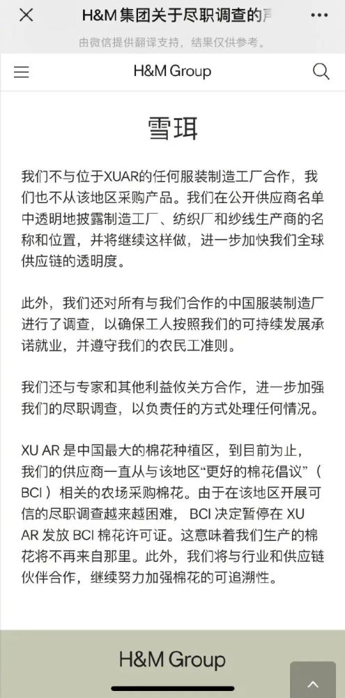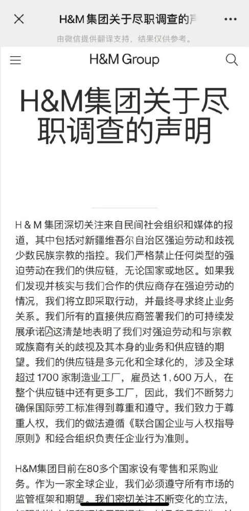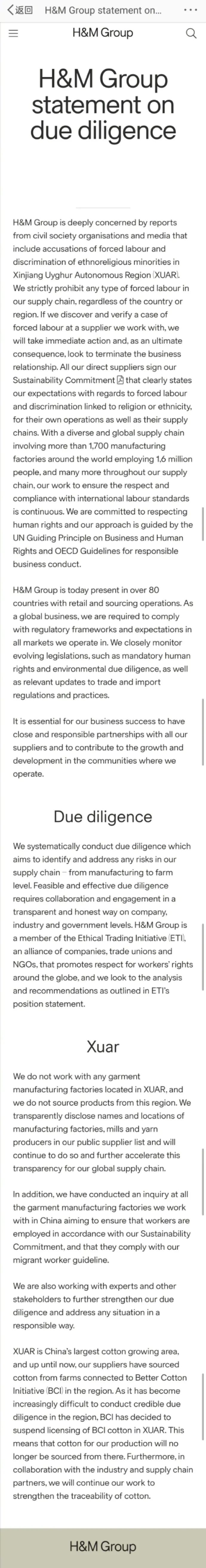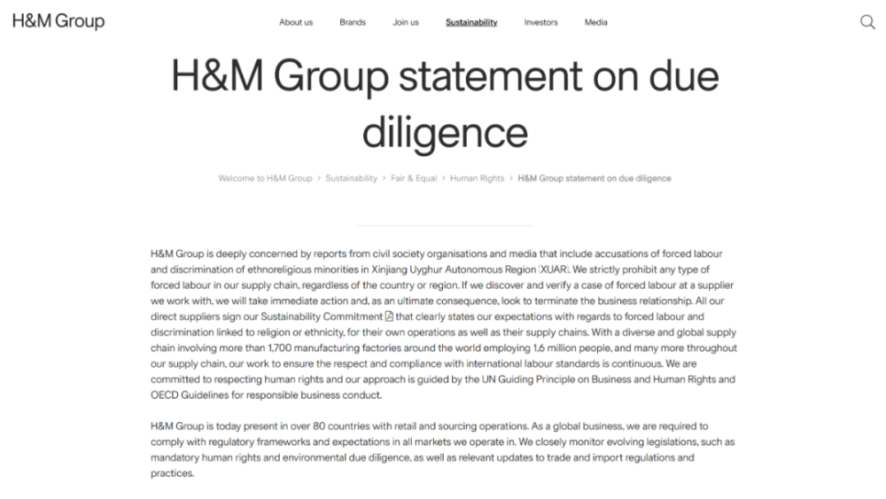 H&M集團,在網(wǎng)站發(fā)布的一份聲明《H&M Group statement on due diligence》引發(fā)關(guān)注。