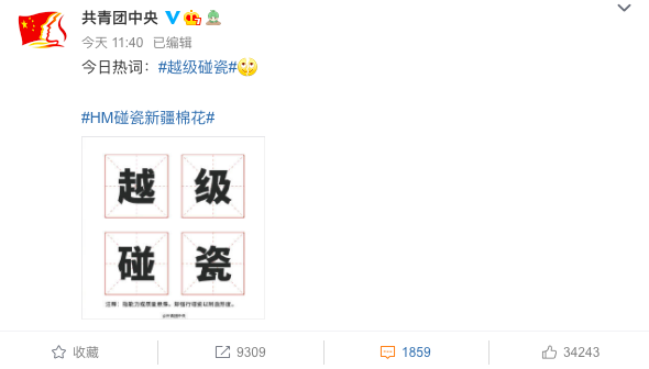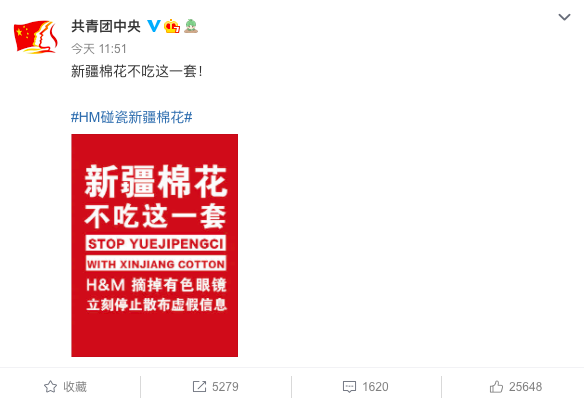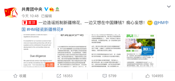 H&M集團聲明一出,以央視新聞為代表的官方媒體立即發(fā)聲定下此事調(diào)性——“H&M集團的行徑,看似打著維護人權(quán)的旗幟,實則嚴(yán)重違背公理良知,目的是破壞中國企業(yè)和勞動者的發(fā)展空間;聲稱遵循國際市場準(zhǔn)則,實則吃中國的飯、砸中國的鍋,當(dāng)面一套背后一套,毫無企業(yè)社會責(zé)任。中國有龐大的市場,更有開放的姿態(tài),歡迎所有外企來華投資,但底線不可觸碰,有尊重才有買賣。”