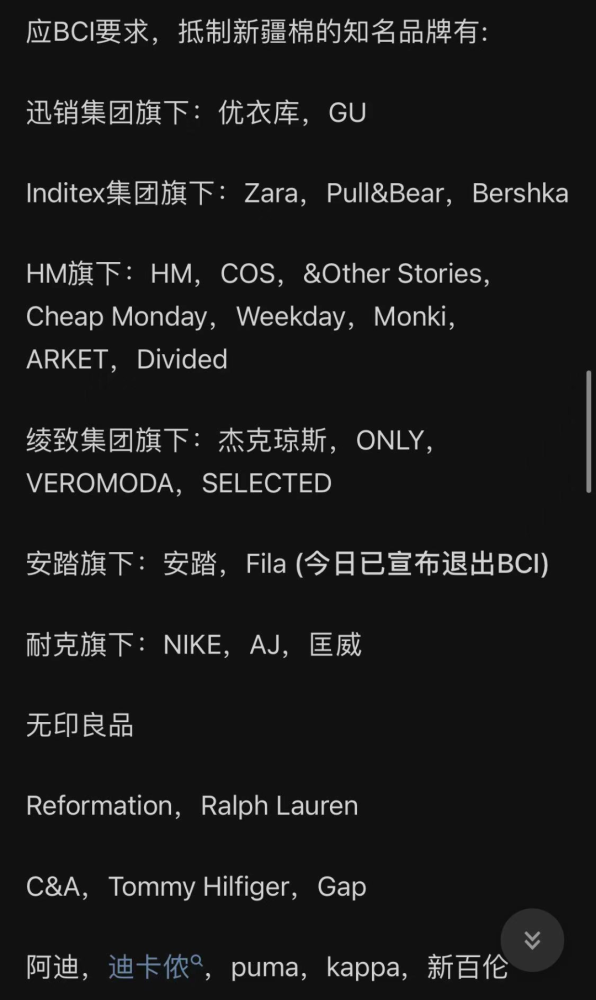 第二步,列名單,明確所有加入、支持BCI(也就是出臺暫停新疆棉花許可標(biāo)準(zhǔn)、搞事情的傀儡組織)的品牌,然后抵制。