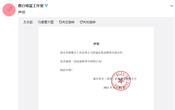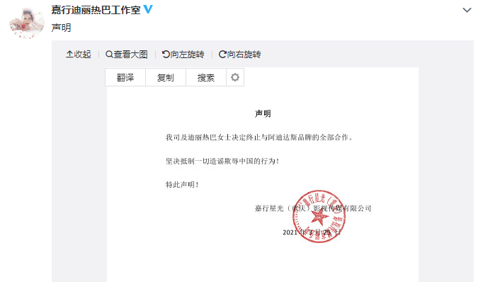 楊冪、迪麗熱巴工作室也發(fā)布聲明,宣布終止與阿迪達斯的合作。