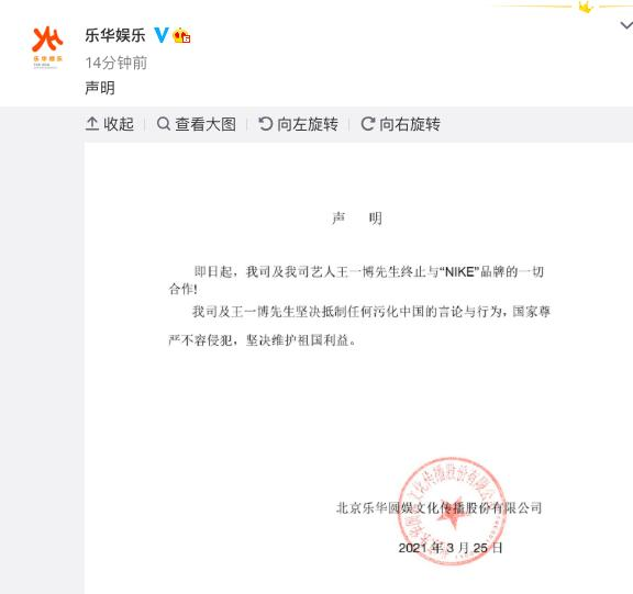 在眾多網(wǎng)友的催促與批評之下,3月25日,樂華娛樂發(fā)文宣布王一博終止與耐克品牌一切合作,并嚴(yán)正聲明:“我司及王一博先生堅決抵制任何污化中國的言論與行為,國家尊嚴(yán)不容侵犯,堅決維護祖國利益。”