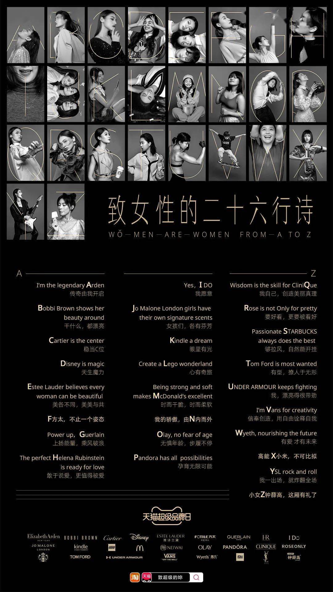 分享我認(rèn)為做得很好的案例:這個(gè)3.8女神節(jié),天貓超級品牌日聯(lián)合從A到Z的26個(gè)超級大牌,獻(xiàn)上一首《致女性的二十六行詩》——致敬女性的平凡和偉大。