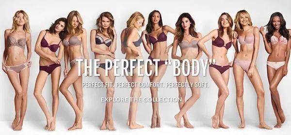 再對比2014年維密廣告惹群怒的事件,2014年維密為了給大秀造勢,發(fā)布了一則站著1平面海報(bào),廣告語寫著“完美身材”,模特兒也是一水的大胸、細(xì)腰、大長腿,黃金比例。