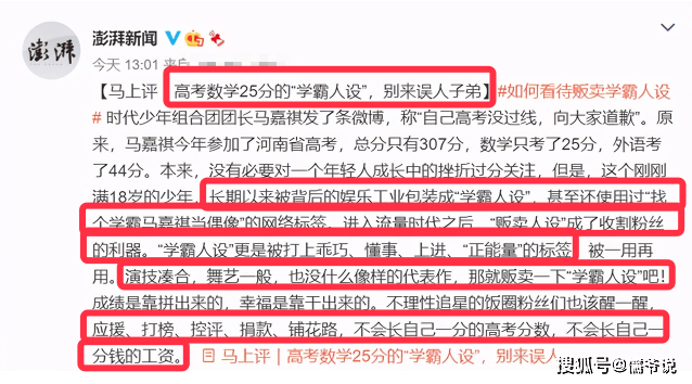 據(jù)了解,官媒表示,進(jìn)入流量時(shí)代,「販賣人設(shè)」成了收割粉絲的利器。還稱馬嘉祺演技湊合、舞藝一般,沒(méi)什么像樣的代表作,被打上「學(xué)霸人設(shè)」「乖巧」「懂事」「正能量」標(biāo)簽,呼吁粉絲也該醒一醒,應(yīng)援、打榜不會(huì)長(zhǎng)自己一分高考成績(jī),不會(huì)漲自己一分錢工資。