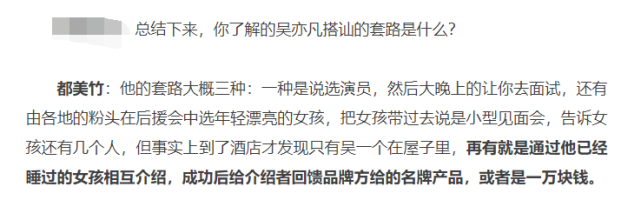 隨著都美竹接受媒體采訪,更多事件細(xì)節(jié)被挖掘出來,比如她曝光了吳亦凡的三種搭訕套路:“一種是說選演員,然后大晚上的讓你去面試,還有由各地的粉頭在后援會中選年輕漂亮的女孩,把女孩帶過去說是小型見面會,告訴女孩還有幾個人,但事實上到了酒店才發(fā)現(xiàn)只有吳一個在屋子里,再有就是通過女孩相互介紹,成功后給介紹者回饋品牌方給的名牌產(chǎn)品,或者是一萬塊錢。”