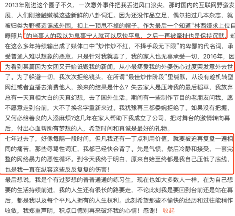 當(dāng)年最早和吳亦凡傳出感情風(fēng)波的林西婭也在微博上發(fā)文“七年,正義?拿來吧你。”疑似喊話吳亦凡。這位曾受到吳亦凡粉絲的瘋狂謾罵及網(wǎng)絡(luò)暴力的女孩,也終于揭竿而起。