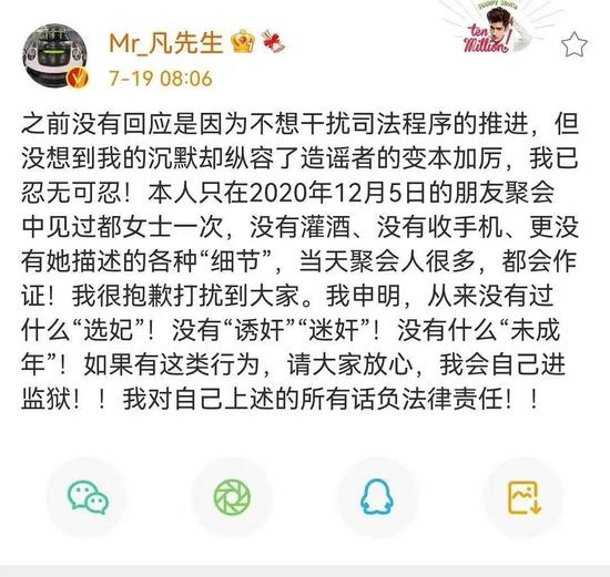 從應(yīng)對速度看,距離“都美竹”發(fā)布第一篇爆料博文已經(jīng)過去了11天,直到7月19日早晨,吳亦凡才對此事做出回應(yīng)。