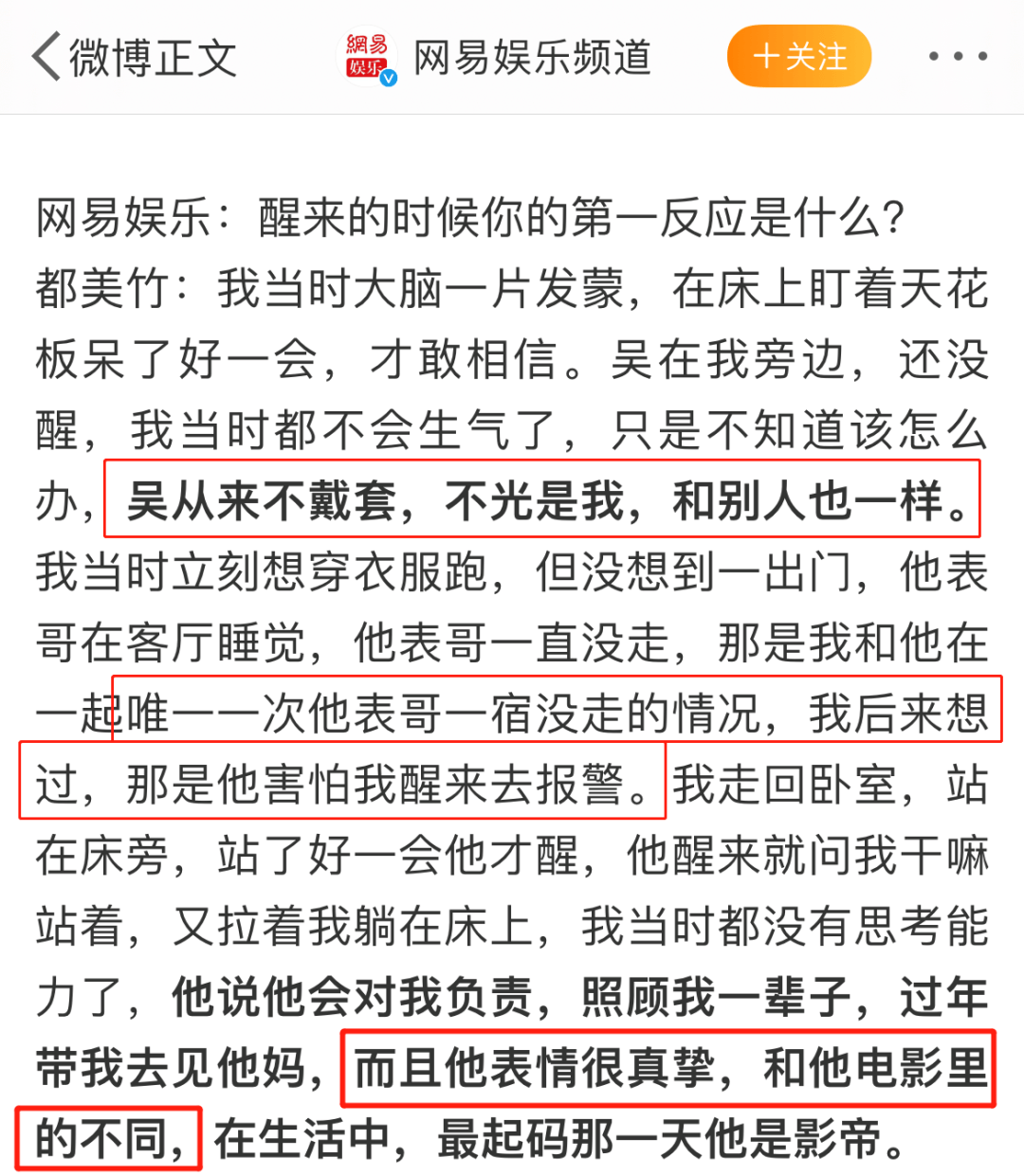而在事發(fā)后,吳亦凡還對她承諾會負(fù)責(zé)會照顧她一輩子。都美竹感慨說,“在生活中,他也就那一天是影帝”。