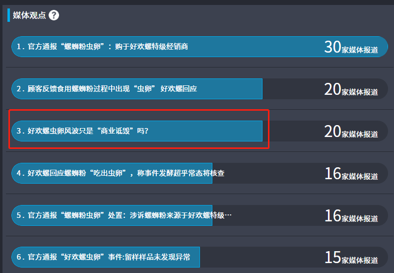 知微事見顯示,針對(duì)此次事件,有20家媒體的報(bào)道標(biāo)題為“好歡螺蟲卵風(fēng)波只是‘商業(yè)詆毀’嗎?”表達(dá)了對(duì)好歡螺官方回應(yīng)的質(zhì)疑。