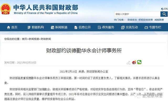 2月10日,財(cái)政部公開(kāi)表示,高度重視德勤華永會(huì)計(jì)師事務(wù)所員工舉報(bào)問(wèn)題,第一時(shí)間約談該所主要負(fù)責(zé)人,要求該所進(jìn)行認(rèn)真自查,并稱(chēng)2021年將對(duì)注冊(cè)會(huì)計(jì)師行業(yè)突出問(wèn)題進(jìn)行集中整治。同日,中國(guó)注冊(cè)會(huì)計(jì)師協(xié)會(huì)表態(tài),約談德勤華永會(huì)計(jì)師事務(wù)所,將配合有關(guān)監(jiān)管部門(mén)做好調(diào)查工作,從嚴(yán)加強(qiáng)行業(yè)自律監(jiān)管,主動(dòng)排查風(fēng)險(xiǎn),對(duì)違反執(zhí)業(yè)準(zhǔn)則規(guī)則和職業(yè)道德規(guī)范的會(huì)計(jì)師事務(wù)所和注冊(cè)會(huì)計(jì)師,以“零容忍”的態(tài)度,堅(jiān)決依規(guī)懲戒,切實(shí)維護(hù)金融市場(chǎng)健康穩(wěn)定發(fā)展。