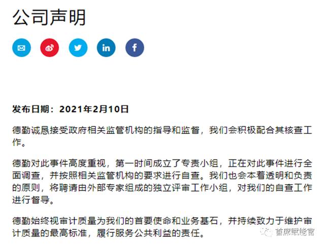 當(dāng)天夜間,德勤回應(yīng)稱(chēng),會(huì)積極配合核查工作。第一時(shí)間成立了專(zhuān)責(zé)小組,正在對(duì)此事件進(jìn)行全面調(diào)查,并按照相關(guān)監(jiān)管機(jī)構(gòu)的要求進(jìn)行自查。