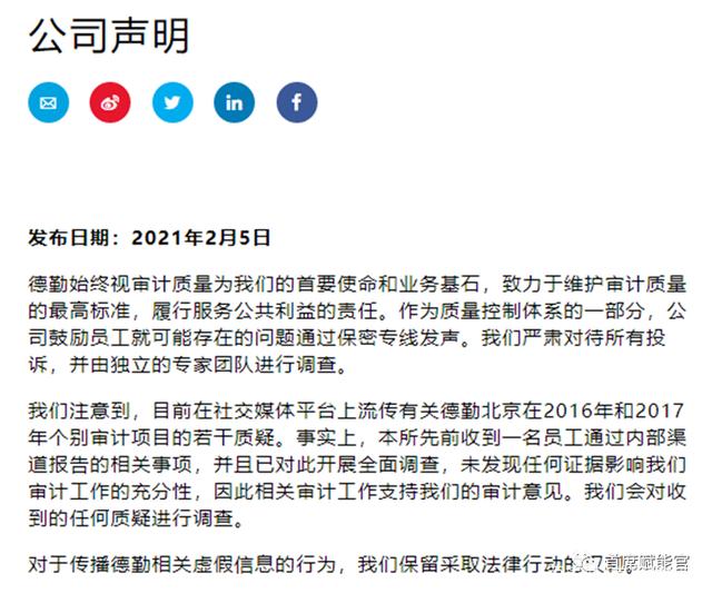 2月5日,德勤發(fā)布聲明稱(chēng)“本所先前收到一名員工通過(guò)內(nèi)部渠道報(bào)告的相關(guān)事項(xiàng),并且已對(duì)此開(kāi)展全面調(diào)查,未發(fā)現(xiàn)任何證據(jù)影響我們審計(jì)工作的充分性,因此相關(guān)審計(jì)工作支持我們的審計(jì)意見(jiàn)。我們會(huì)對(duì)收到的任何質(zhì)疑進(jìn)行調(diào)查?!?/span>