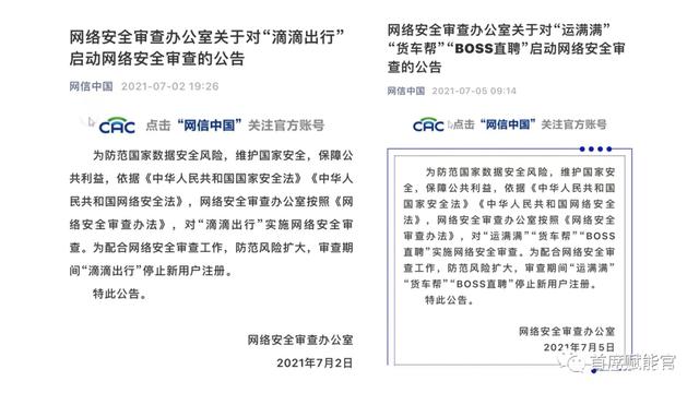 7月5日,國(guó)家網(wǎng)信辦發(fā)布對(duì)“運(yùn)滿(mǎn)滿(mǎn)”、“貨車(chē)幫”、“BOSS直聘”啟動(dòng)網(wǎng)絡(luò)安全審查的公告,而這幾家企業(yè)均于6月在美上市。