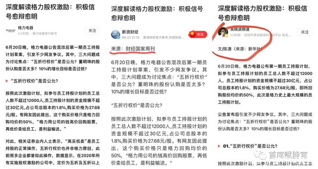6月22日,《財(cái)經(jīng)國(guó)家周刊》發(fā)表題為《深度解讀格力股權(quán)激勵(lì):積極信號(hào)愈辯愈明》的評(píng)論文章對(duì)格力員工持股計(jì)劃進(jìn)行正面解讀,而后知名自媒體“吳曉波頻道”也對(duì)該文進(jìn)行轉(zhuǎn)發(fā)擴(kuò)散。
