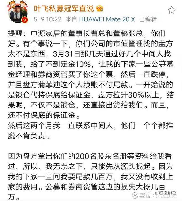 2021年5月9日,微博賬號(hào)“葉飛私募冠軍直說(shuō)”公開(kāi)向上市公司中源家居董事長(zhǎng)及董秘喊話(huà),稱(chēng)后者市值管理找的操盤(pán)方?jīng)]有向下家(接盤(pán)方)及時(shí)支付尾款,且因中源家居股價(jià)連續(xù)下跌,參與其中的公募基金經(jīng)理和券商資管損失很大,自己作為中間人已經(jīng)難以向下家交代。除了中源家居,其還在爆料中提到了維信諾、昊志機(jī)電、隆基機(jī)械、東方時(shí)尚等上市公司,并揚(yáng)言要曝光不低于18家上市公司的類(lèi)似內(nèi)幕。