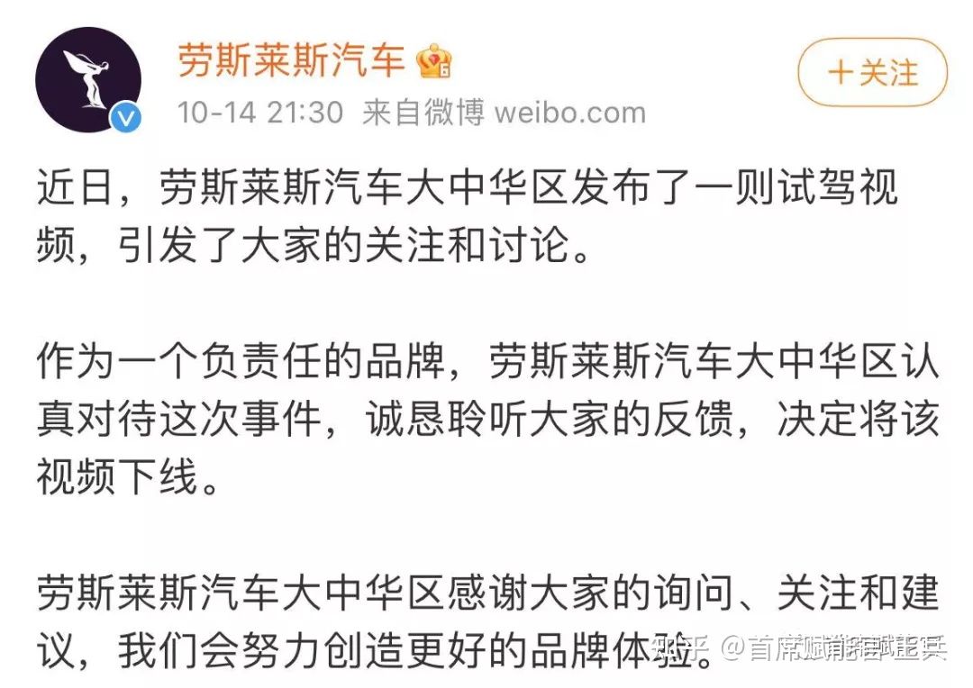 【同類案例】2021年9月24日,勞斯萊斯官方賬號發(fā)了一段營銷視頻,視頻主角是網(wǎng)紅晚晚林涵夫妻。發(fā)布該視頻所配的文案是:“勞斯萊斯庫里南西域?qū)ふ椋v行天山之南,展現(xiàn)出這款奢華汽車的冒險精神,盡享“無處不從容”的人生巔峰?!眱?nèi)容發(fā)出后,遭到部分網(wǎng)友的反感,認(rèn)為這是拉低用戶的檔次,更有網(wǎng)友不斷起底這視頻主角晚晚林涵夫妻的“黑料”。10月11日,王思聰作為車主,在評論區(qū)稱“以后不會買了”,輿論進一步發(fā)酵。10月14日勞斯萊斯下架視頻并發(fā)布聲明,表示會認(rèn)真對待此次事件,誠懇聆聽大家的反饋,“決定將該視頻下架?!?/p>