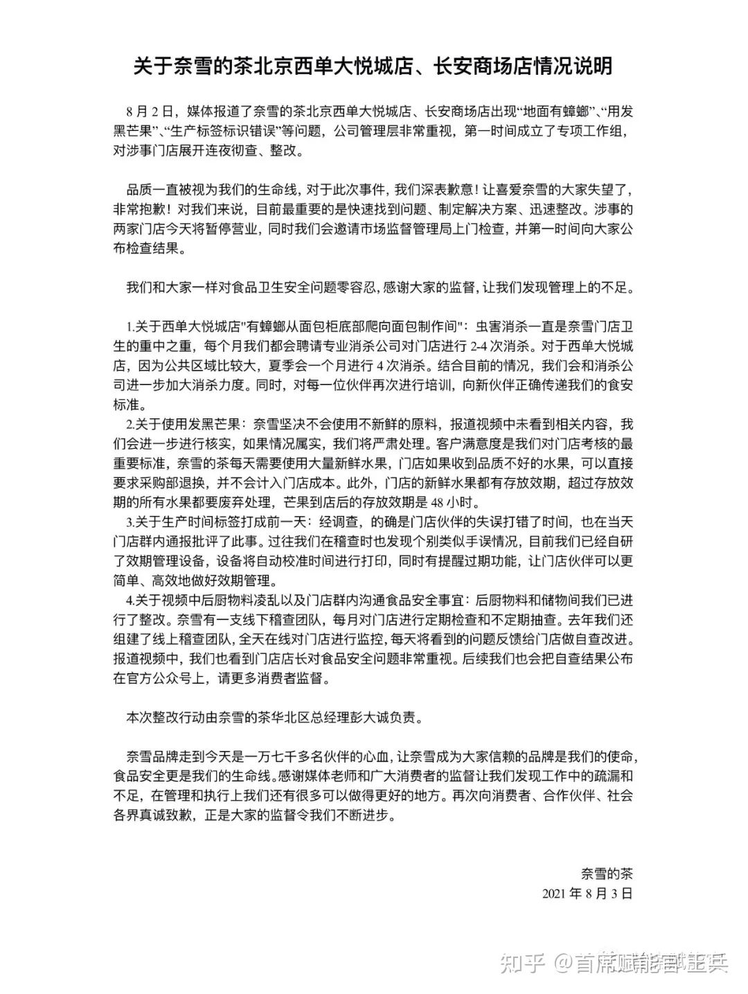 2021年8月2日晚,新華社發(fā)布報道《記者臥底奈雪的茶打工:蟑螂不用管、標(biāo)簽隨意換》稱,記者通過隨機應(yīng)聘“臥底”網(wǎng)紅奶茶店奈雪的茶,發(fā)現(xiàn)其多家分店存在蟑螂亂爬、水果腐爛、抹布不洗、標(biāo)簽不實等問題。8月3日凌晨,@奈雪的茶Nayuki發(fā)布情況說明稱:8月2日,媒體報道了奈雪的茶北京西單大悅城店、長安商場店出現(xiàn)“地面有蟑螂”、“用發(fā)黑芒果”、“生產(chǎn)標(biāo)簽標(biāo)識錯誤”等問題,公司管理層非常重視,第一時間成立了專項工作組,對涉事門店展開連夜徹查、整改。涉事的兩家門店今天將暫停營業(yè),同時會邀請市場監(jiān)督管理局上門檢查,并第一時間公布檢查結(jié)果?!边€在微博評論區(qū)貼出涉事門店的消殺報告以及新鮮水果存放效期標(biāo)準(zhǔn)。