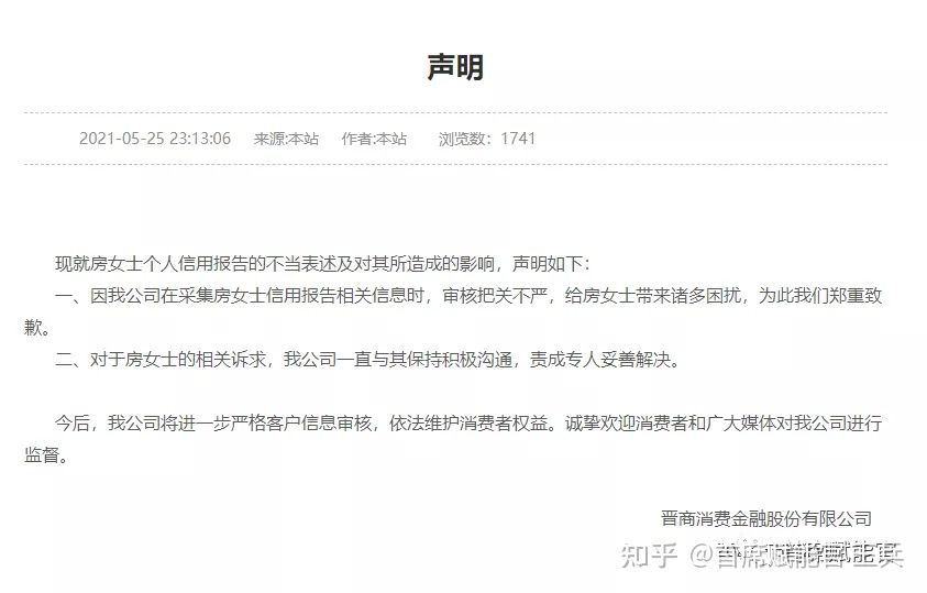 據(jù)媒體報道,2018年4月,房女士在位于南通中南大廈的晉商消費金融股份有限公司分支機構(gòu)簽署了一份162000元的個人消費貸款合同,貸款期限約定36個月,當(dāng)月下款時就被不明不白扣掉了11340元。房女士從2018年5月持續(xù)按約還款,直到2020年1月,21個月內(nèi)累計還款124902.12元。新冠疫情發(fā)生后,晉商消費金融公司針對受疫情影響暫無法按期還款的客戶推出一些優(yōu)惠服務(wù),房女士也申請了貸款展期。征信報告顯示,這項貸款在2020年2-12月沒有還款的計劃安排。進入2021年,房女士沒有恢復(fù)還款,因為“對當(dāng)初下款被扣的1萬多元持有異議,又一直沒有得到合理的解釋”。事件發(fā)生后,人民銀行太原中心支行于4月8日、5月25日,先后兩次約談晉商消費金融公司,出具監(jiān)管意見、嚴(yán)肅提出后續(xù)整改要求。5月25日深夜,晉商消金官網(wǎng)發(fā)布聲明,就房女士個人信用報告中的不當(dāng)表述及對其所造成的影響致歉;同時,晉商消金表示歡迎消費者和廣大媒體對該公司進行監(jiān)督。