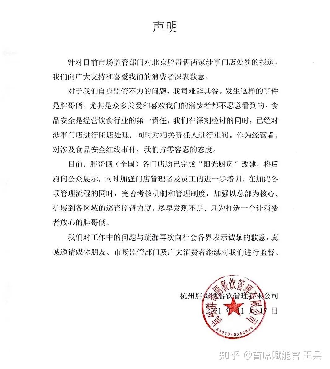 同日,北京市豐臺區(qū)市場監(jiān)督管理局對涉事門店的相關(guān)食材進行現(xiàn)場抽檢,并表示擬對其進行約談,后續(xù)將依法進行立案調(diào)查。北京市朝陽區(qū)市場監(jiān)管局執(zhí)法人員也對涉事門店進行了檢查,要求涉事門店停業(yè)整頓,并下線第三方訂餐平臺的外賣服務(wù),對涉事門店負責(zé)人進行了約談。第二天,胖哥倆創(chuàng)始人、副總裁陳炳斐接受媒體采訪時表示,公司總裁張靈翰已前往北京配合調(diào)查,依據(jù)調(diào)查結(jié)果,涉事兩家門店或被永久關(guān)閉。然而,就在這位總裁面對媒體痛哭流涕道歉之后,胖哥倆品控部負責(zé)人方兵兵卻回應(yīng)時辯稱,“實際是活蟹宰殺,當(dāng)天沒用完,放到了第二天,符合公司規(guī)范。”11月17日,#北京胖哥倆使用隔夜死蟹被罰50萬#登上熱搜。根據(jù)北京市市場監(jiān)督局官網(wǎng)顯示,北京市豐臺區(qū)市場監(jiān)督管理局對胖哥倆主體公司北京宏聚餐飲有限公司進行警告、罰款50萬元并沒收違法所得6974元。針對處罰,胖哥倆發(fā)布聲明稱,“胖哥倆各門店均已完成‘陽光廚房’改建,將后廚向公眾展示,同時加強門店管理者及員工的進一步培訓(xùn)?!?/p>