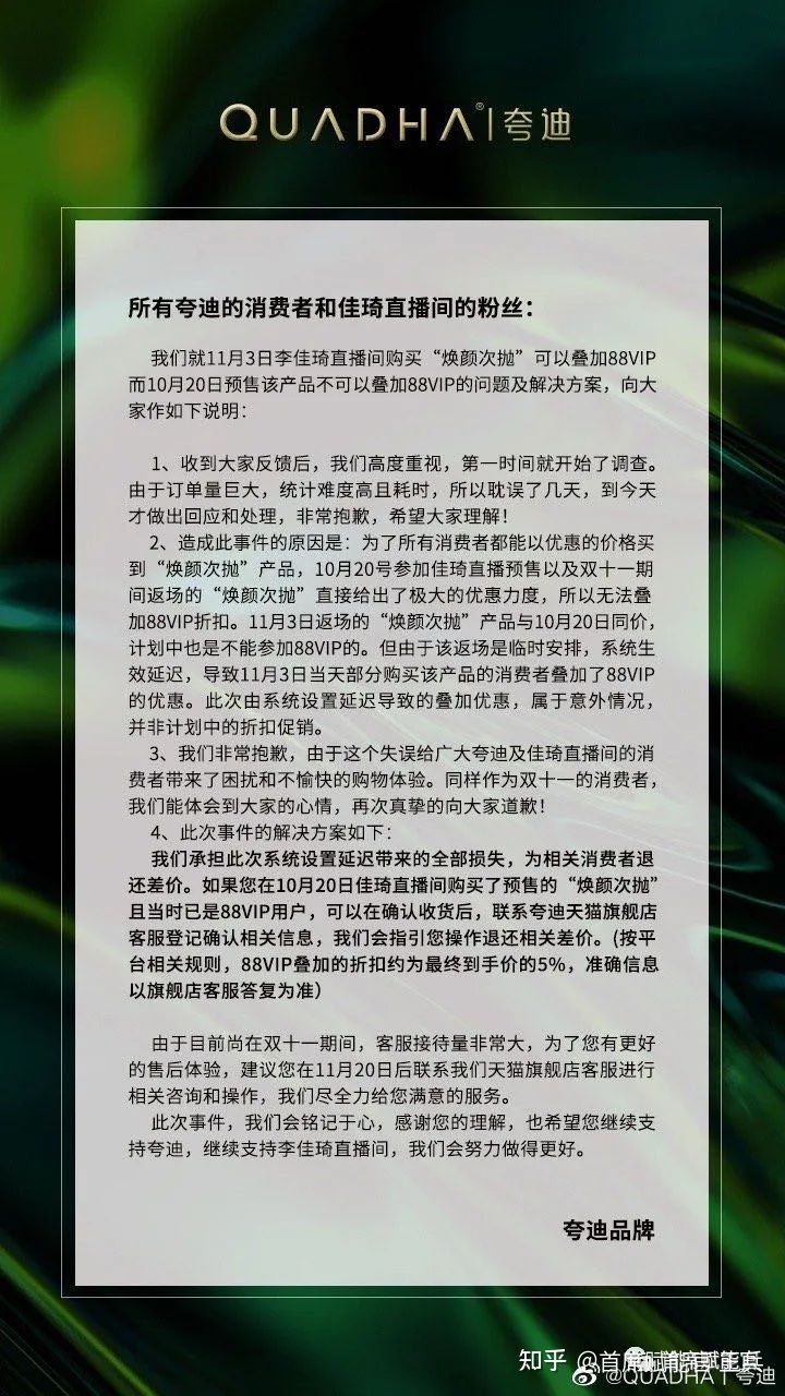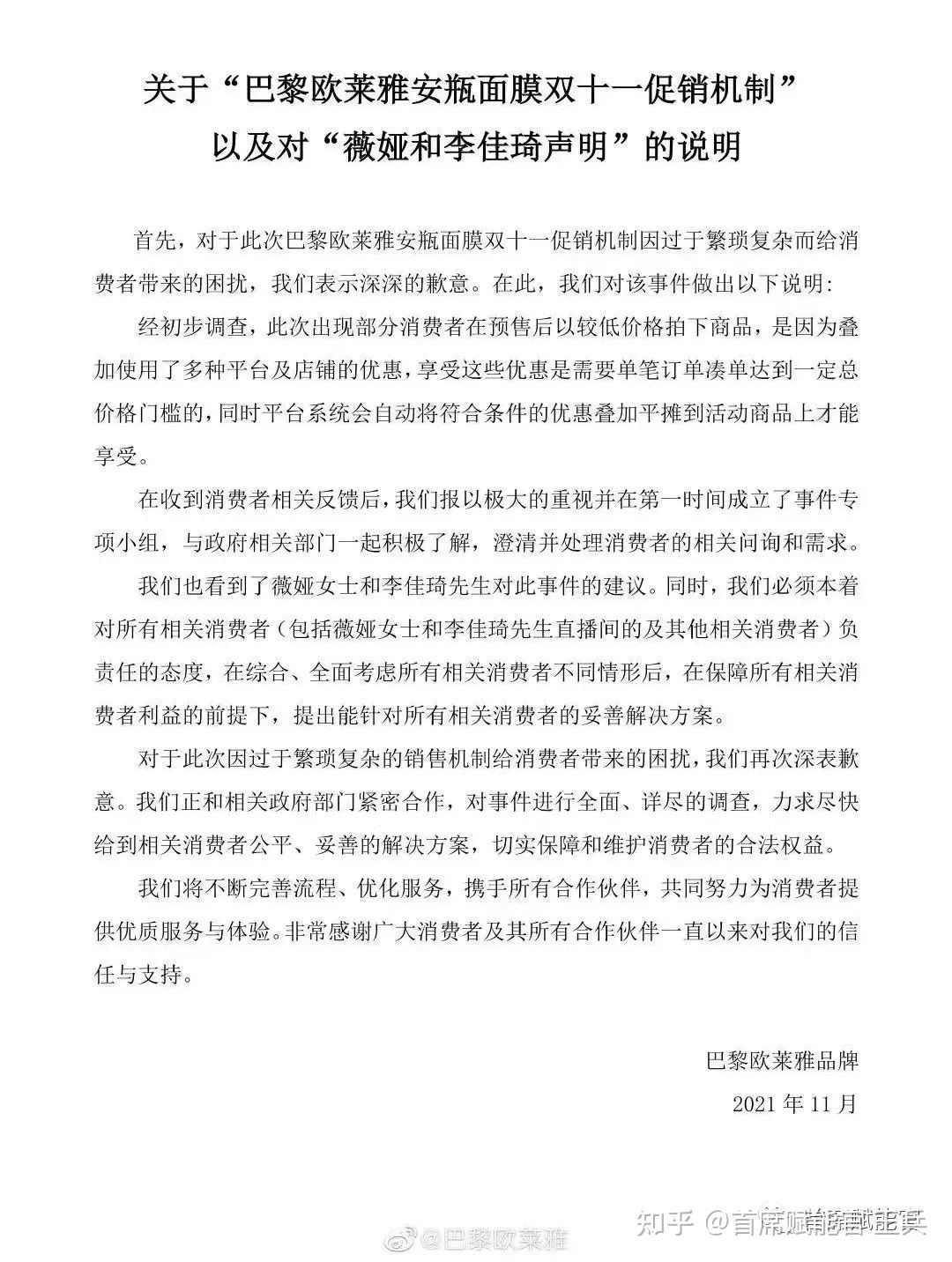 11月18日凌晨2:15,巴黎歐萊雅發(fā)布“關(guān)于‘巴黎歐萊雅安瓶面膜雙十一促銷機制’以及對‘薇婭和李佳琦聲明’的說明”。表示消費者之所以在直播間拿到最低價,是因為疊加了平臺和店鋪999減200的優(yōu)惠券,想要享受這些優(yōu)惠,需要達到一定的消費門檻。在收到消費者相關(guān)反饋后,已成立事件小組,目前正和相關(guān)政府部門緊密合作,力求盡快給到相關(guān)消費者公平、妥善的解決方案。