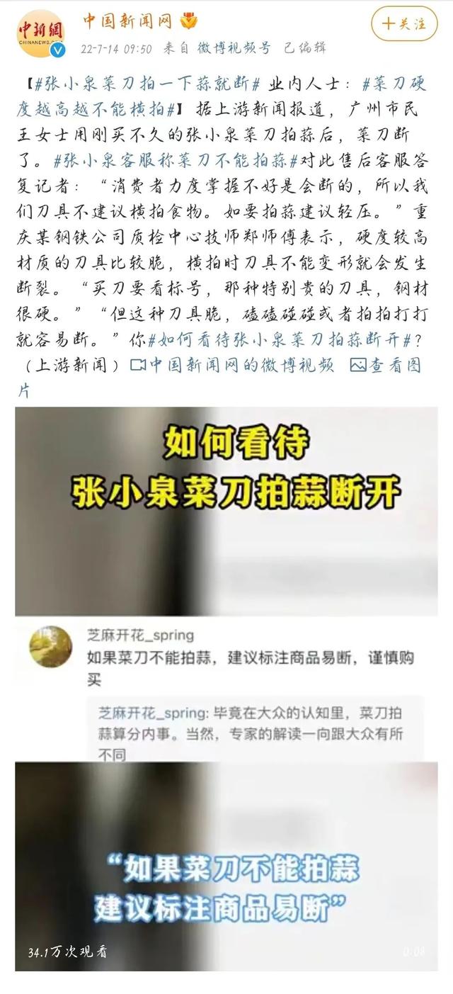 另一方面公眾不是無法理解菜刀的硬度高橫拍容易斷,也并不是一定要抓住一把斷刀不放。在本次事件中,公眾的核心訴求在于品牌方的態(tài)度,希望張小泉給出切實的解決方案,但是很顯然張小泉并沒有意識到這一點。